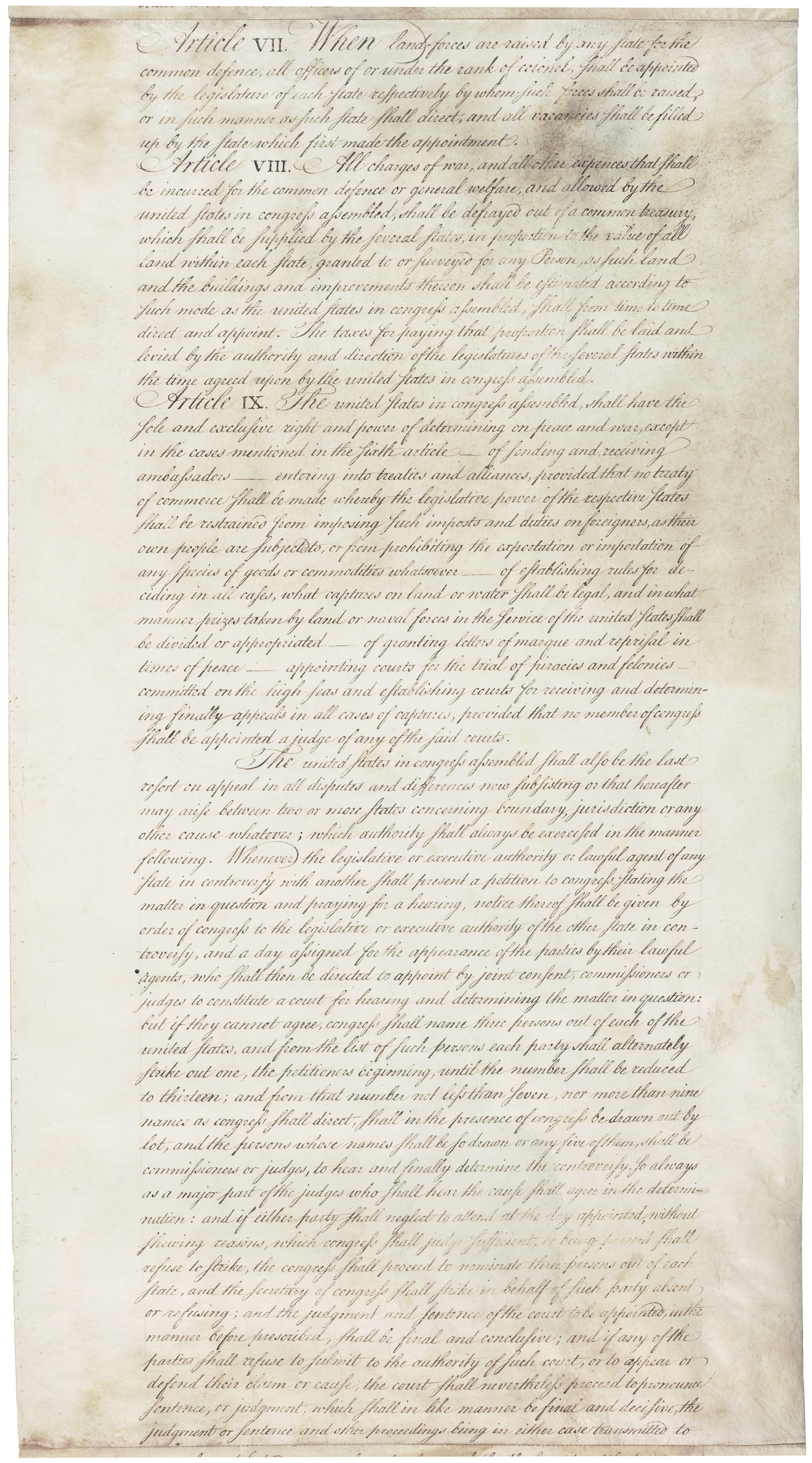 The Articles of Confederation and Perpetual Union was the first written constitution of the United States. Written in 1777 and stemming from wartime urgency, its progress was slowed by fears of central authority and extensive land claims by states. It was not ratified until March 1, 1781. Under these articles, the states remained sovereign and independent, with Congress serving as the last resort on appeal of disputes. Significantly, The Articles of Confederation named the new nation “The United States of America.”
